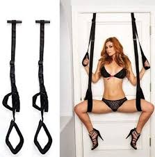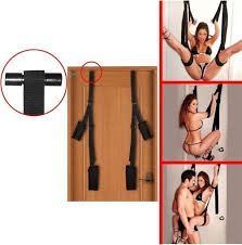 An adjustable door-mounted strap designed for controlled positioning during private roleplay.